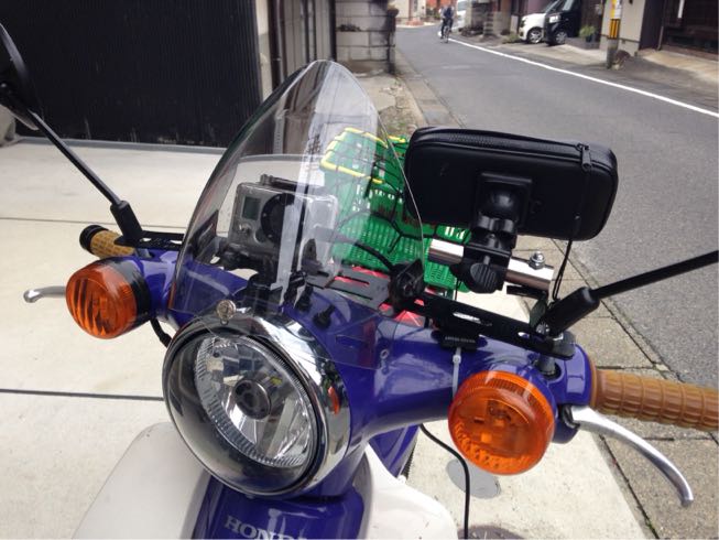 風防はメットのシールドを使い自作、クランプも自作。