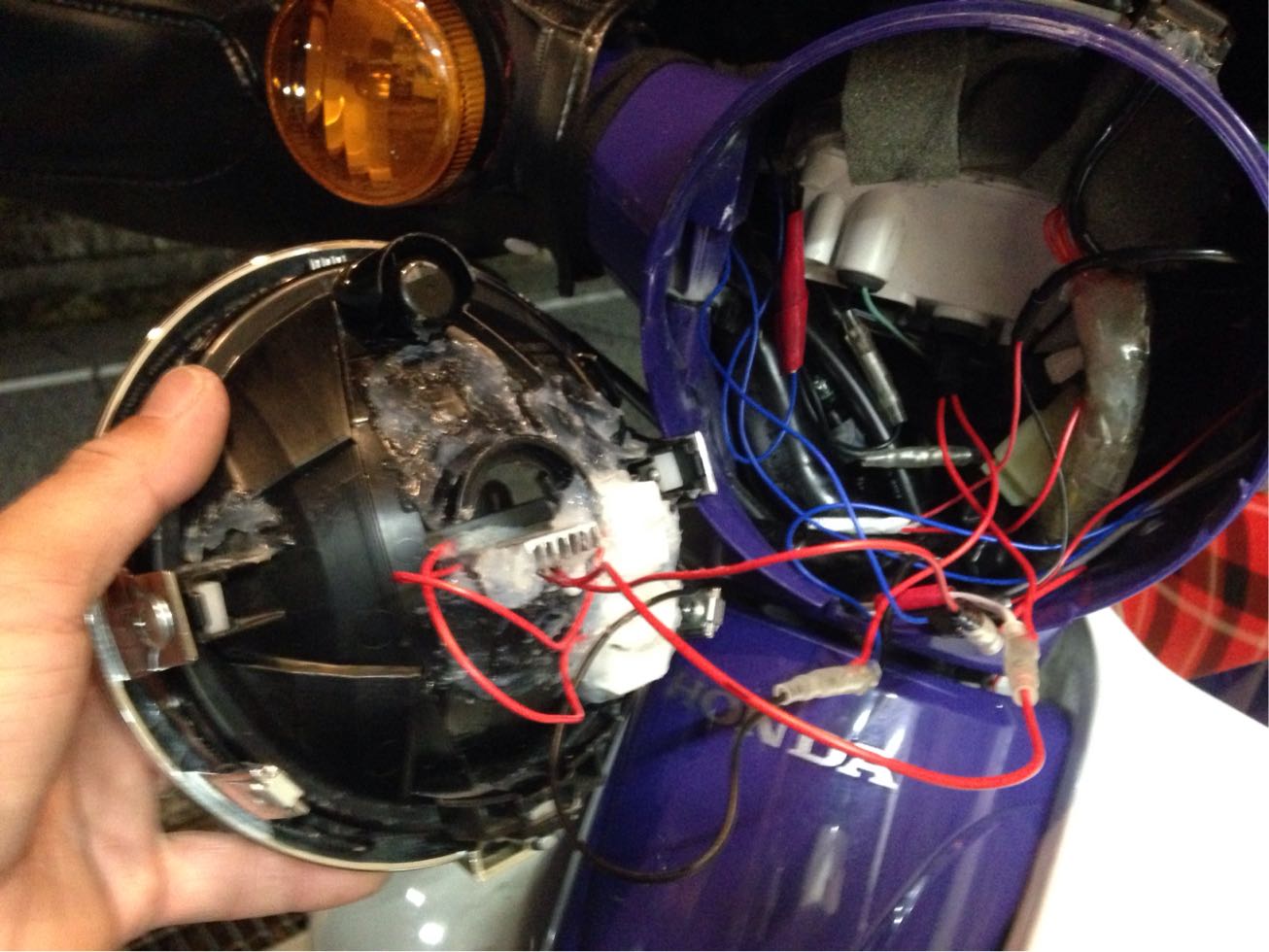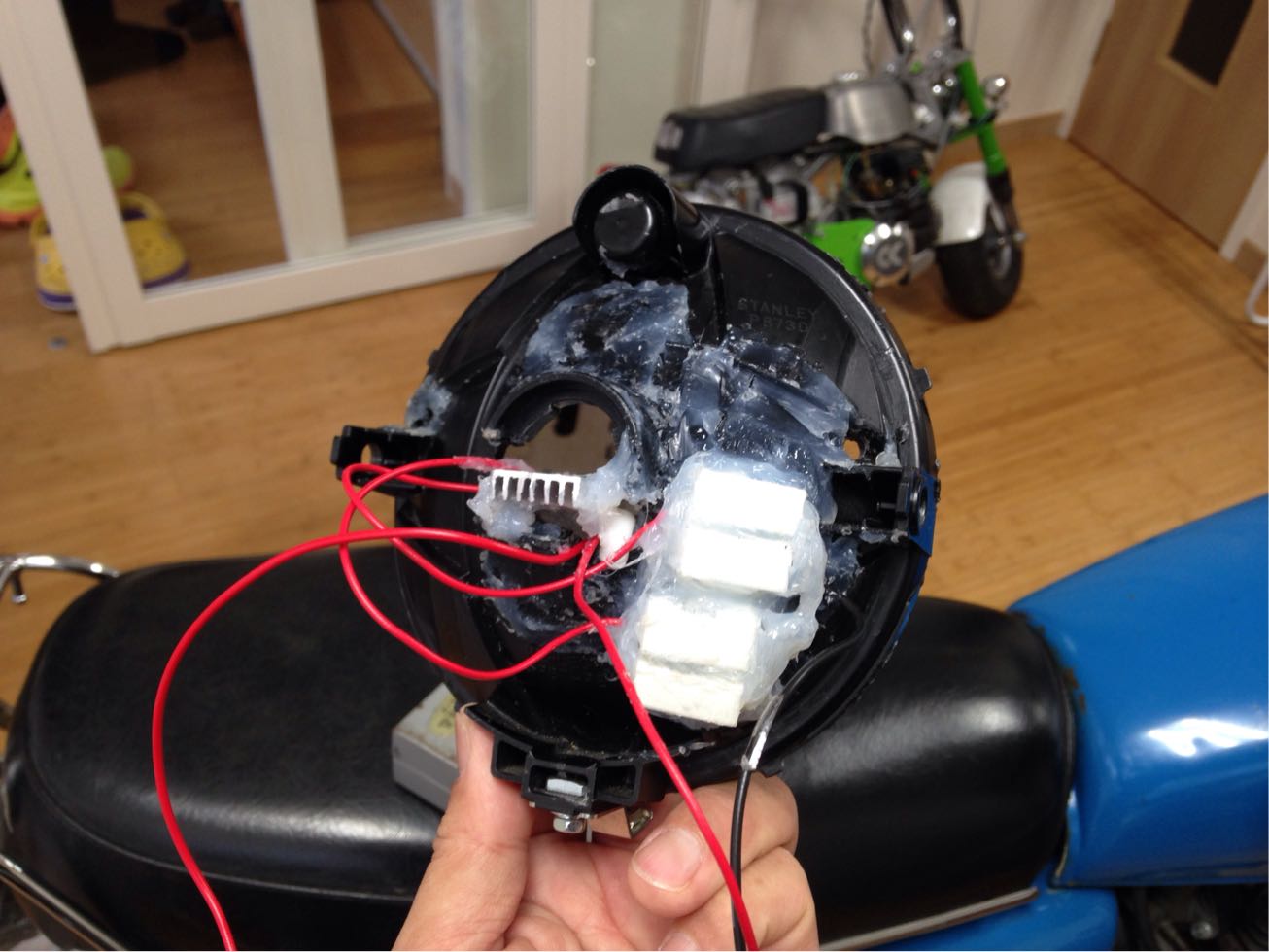 ヘッドライト裏はシフトポジションインジケータ、ポジションライト、LEDヘッドライトの配線とセメント抵抗でごちゃごちゃ(汗)