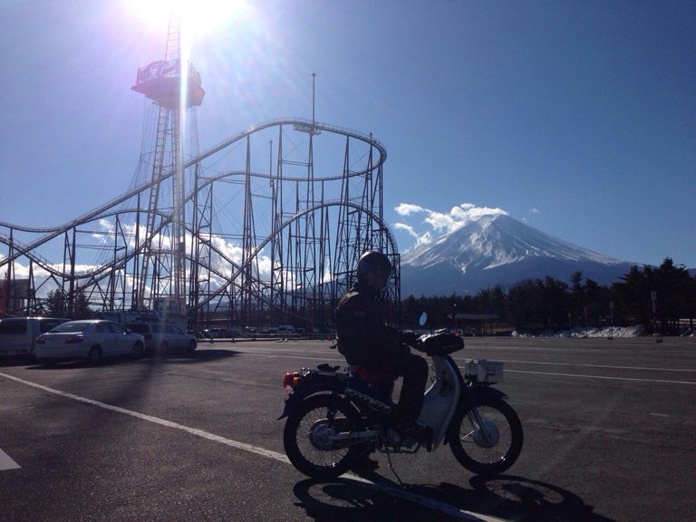 富士山、夫婦タンデムカブツー。子供は富士急ハイランド。