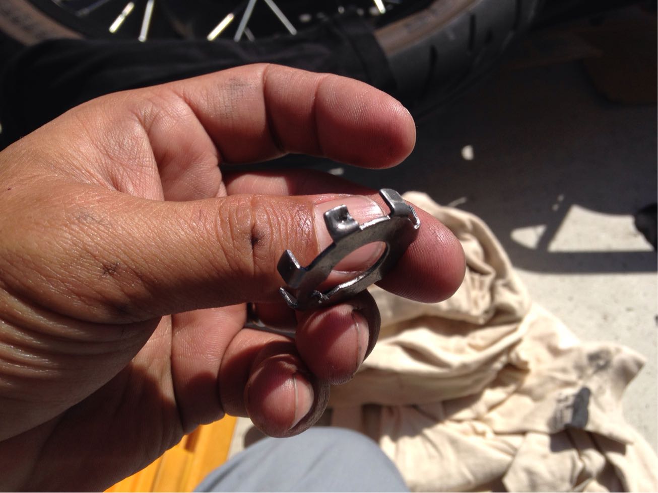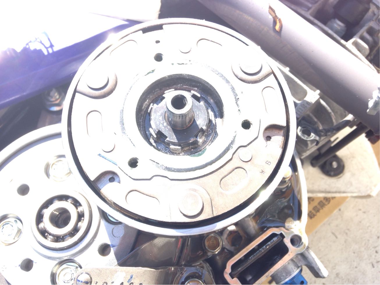 遠心クラッチのロックワッシャの爪が斜めに止めてある、