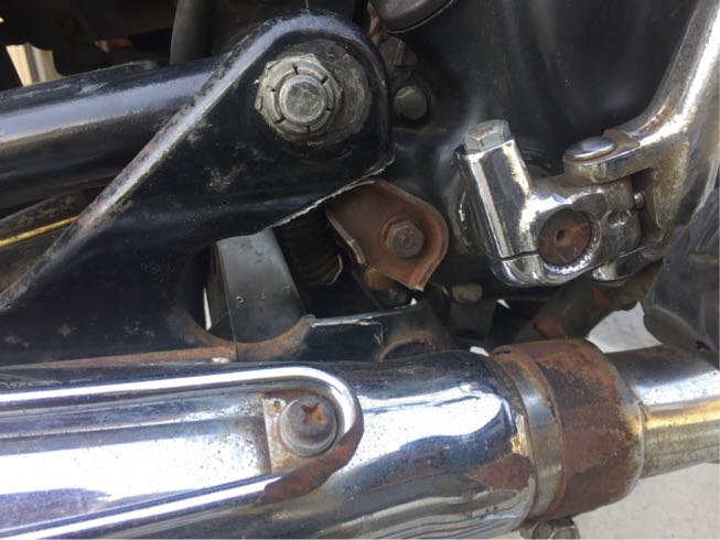デコンプケーブルを引くカムフォロワアームとマフラーマウントが干渉するんで切り落とします。