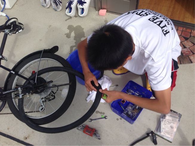 朝から遠征前に長男に自転車のパンク修理をさせ。